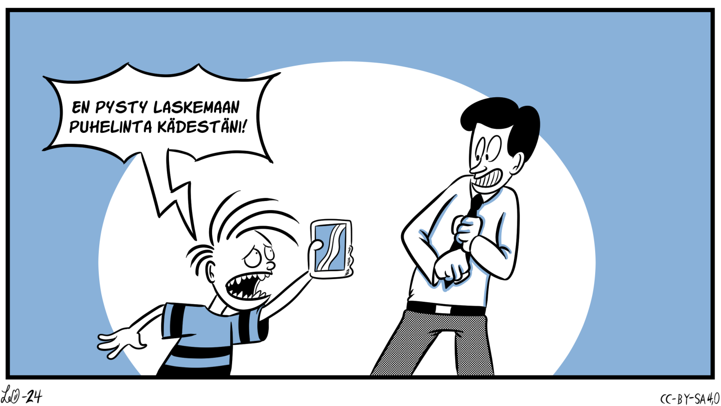 Vitsin takaaYritin tehdä visuaalisemman vitsin. Idea on että puhelin on fuusioitunut pojan käteen, mutten ole varma etä se on visuaalisesti ymmärrettävissä.